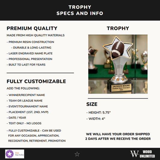 Personalized Football Trophy | Custom Rising Star Resin Award 5.75" | Laser Engraved Gold Name Plate | Team MVP Recognition Gift