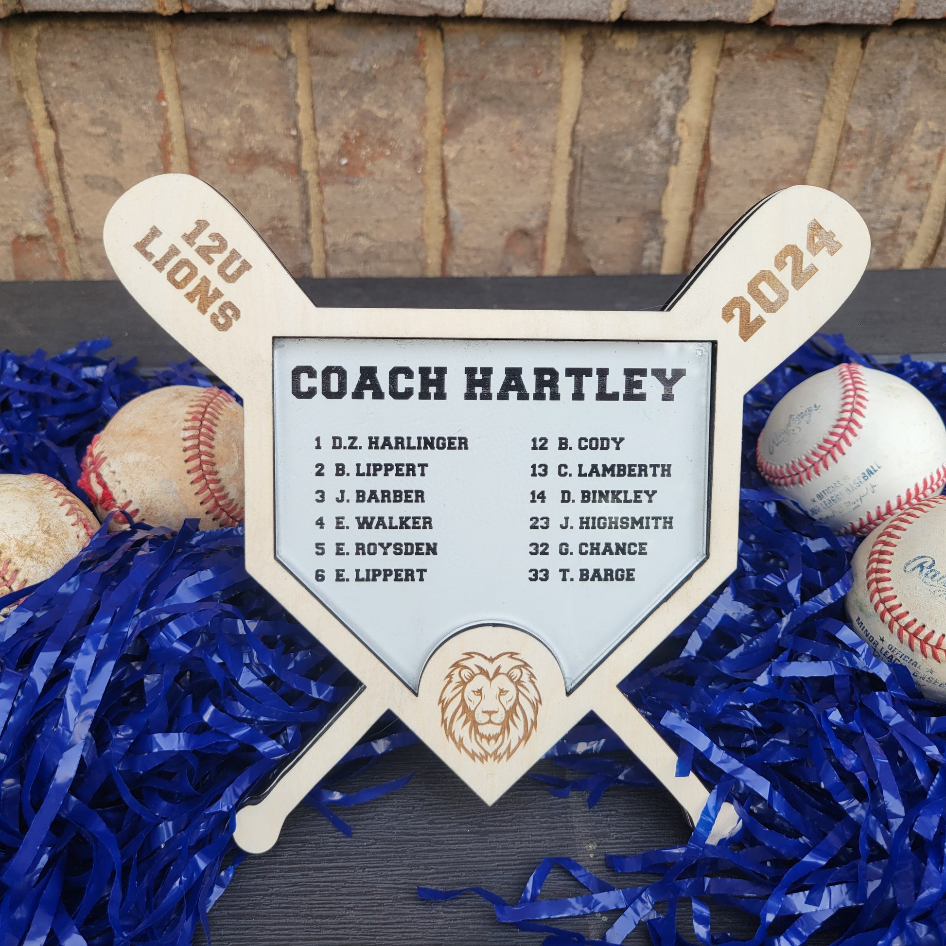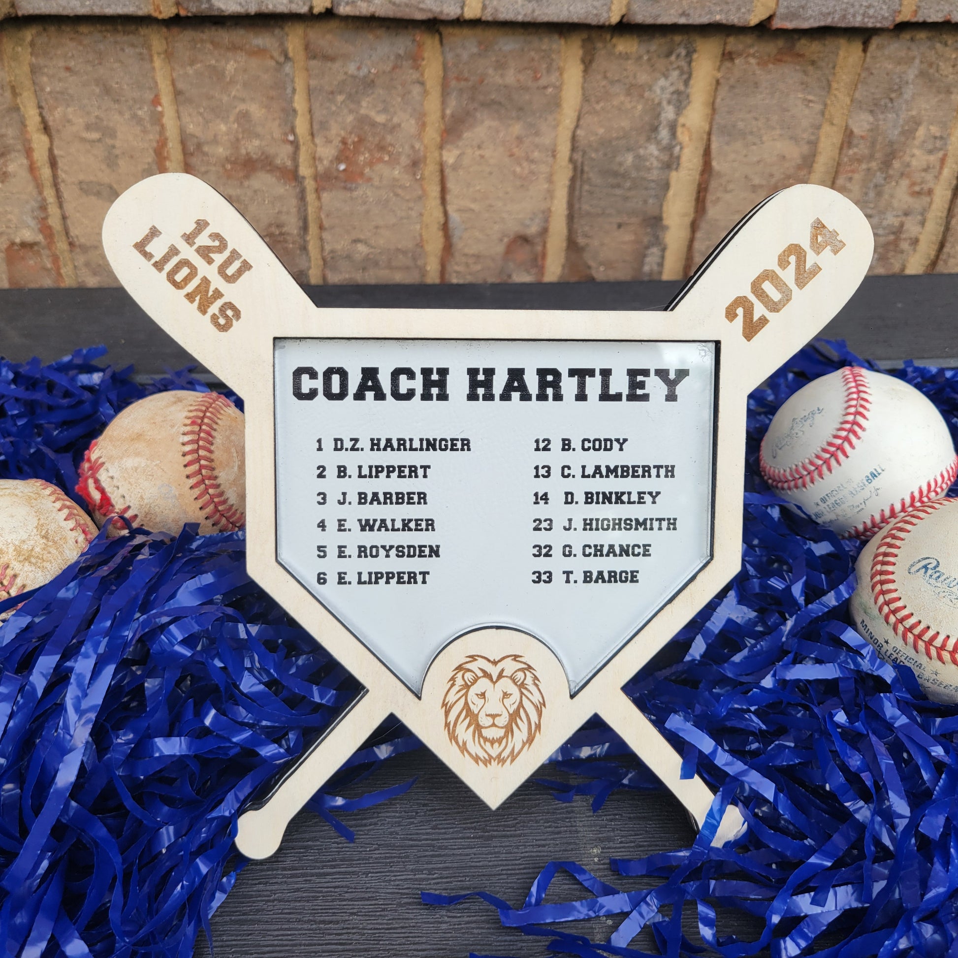 Personalization: Make it truly special by customizing the plaque with the coach's name, team name, year, player names, logo and any additional text you desire. If no team logo is desired, we will engrave a baseball logo in the place where the team logo would ordinarily go.