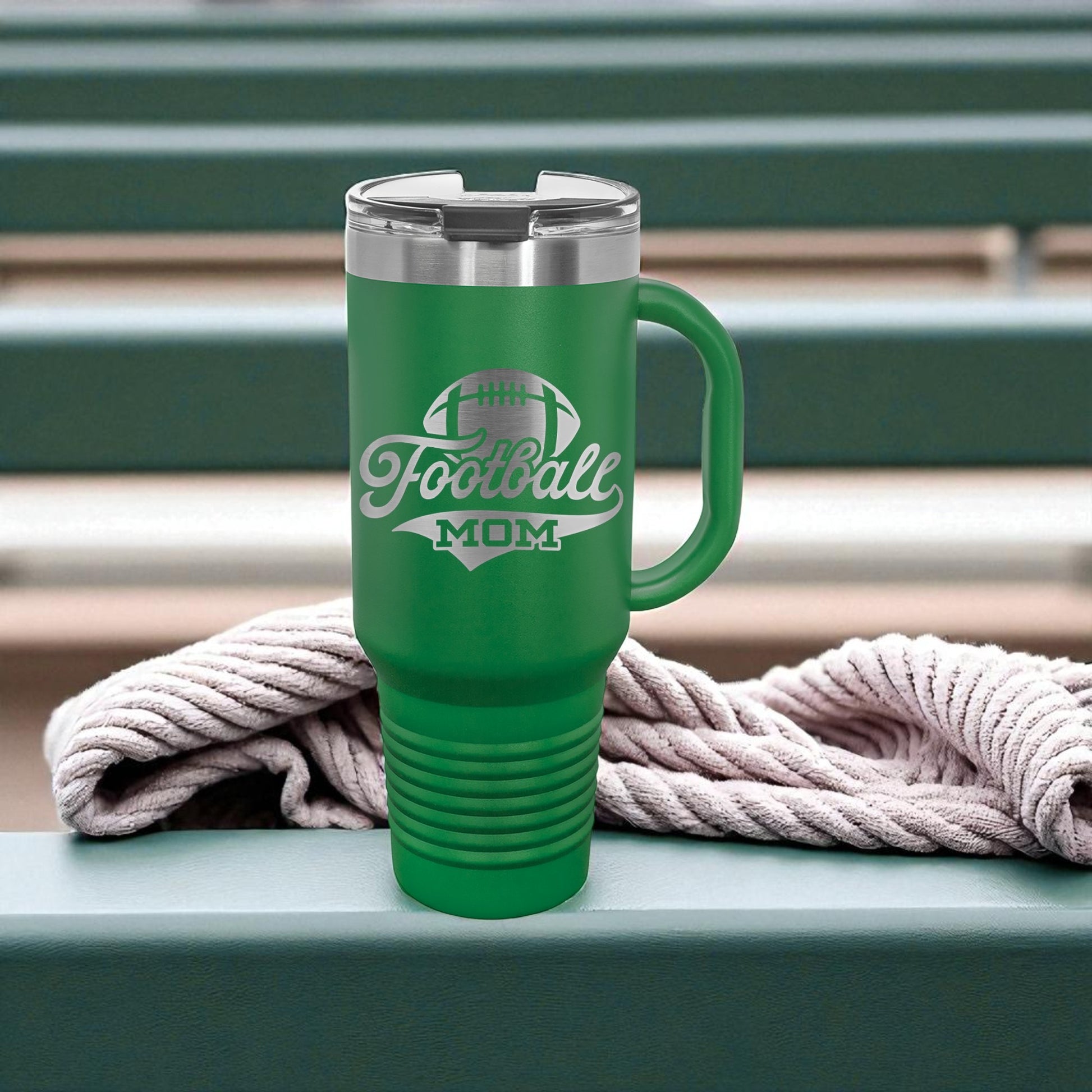 • 40oz handled tumbler with “Football Mom” engraving